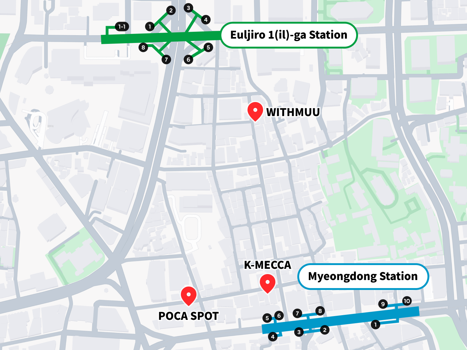 WITHMUUโ€”the official K-POP goods store with locations in Yongsan and Hongdaeโ€”is easily accessible. While Euljiro 1-ga Station is the closest subway stop, a relaxed shopping stroll from Myeongdong Station is also a great option. The store offers a unique experience on every floor: Levels 1 and 2 showcase albums, lucky draws, and artist merch (BT21, RIIZE keyrings, etc.). Level 3 is a cozy lounge, perfect for unboxing your new items or snapping memorable four-cut photos!