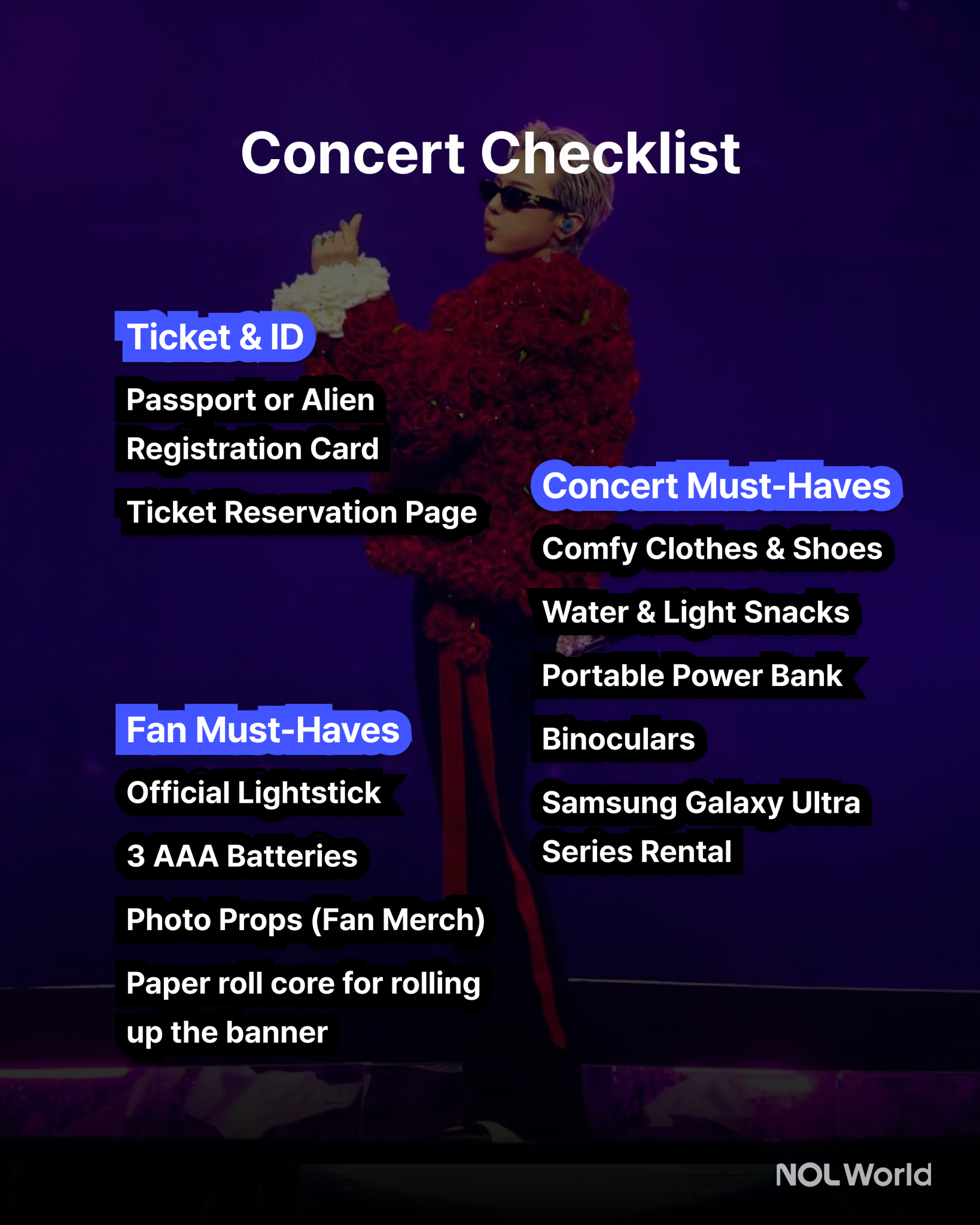 Don’t forget to bring your ID, your official light stick, and extra batteries. For memorable photos, bring some fan merch like photocards or plushies. If your seat is farther from the stage, a pair of binoculars will come in handy, too. With this checklist, you’ll be all set for the concert! ✨