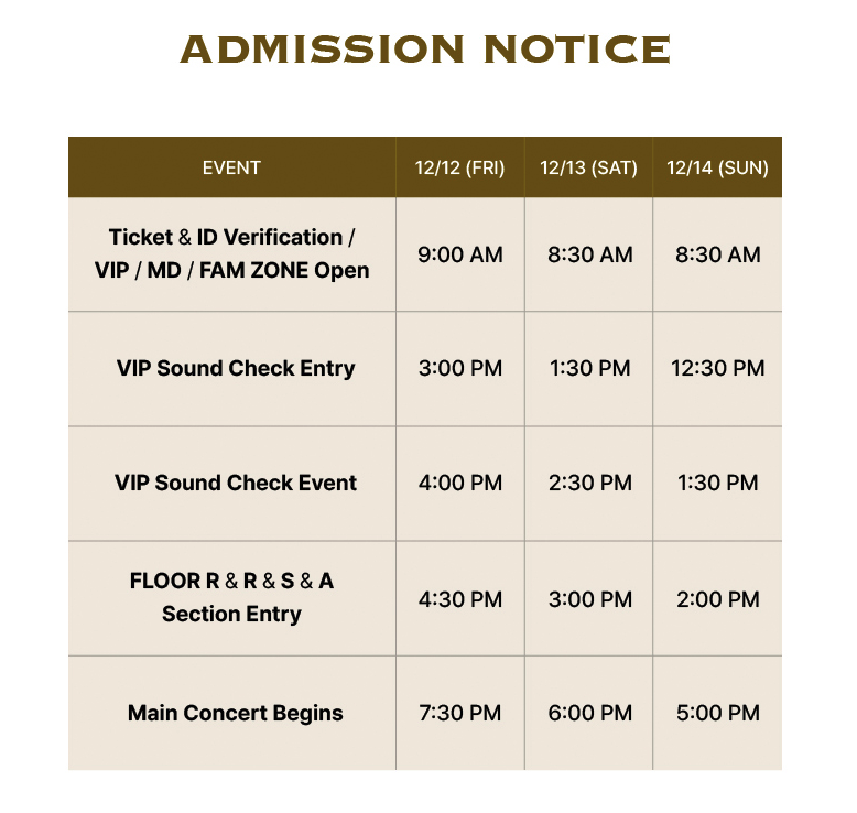 VIP ticket holders can enter 4 hours and 30 minutes before the show to attend the Sound Check event. Entry is permitted only after ID verification at the designated VIP zone. For general admission, entry begins 3 hours before the show.