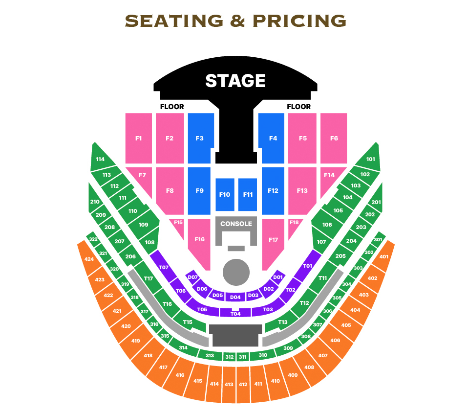 All seats for this concert are reserved seating. On the floor level, chairs are set up on flat ground without elevation. Other floors feature tiered seating with steps.