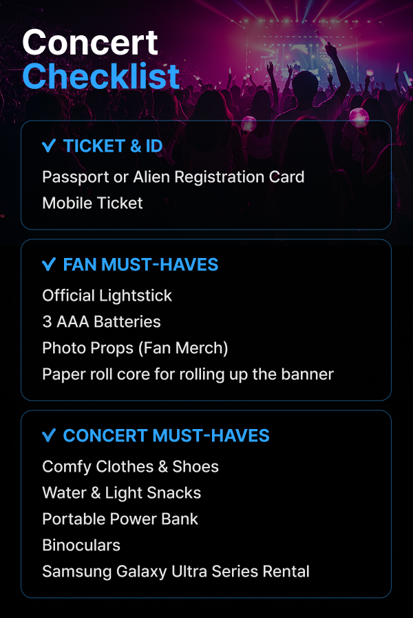 Don’t forget to bring your ID, your official light stick, and extra batteries. For memorable photos, bring some fan merch like photocards or plushies. If your seat is farther from the stage, a pair of binoculars will come in handy, too. With this checklist, you’ll be all set for the concert! ✨