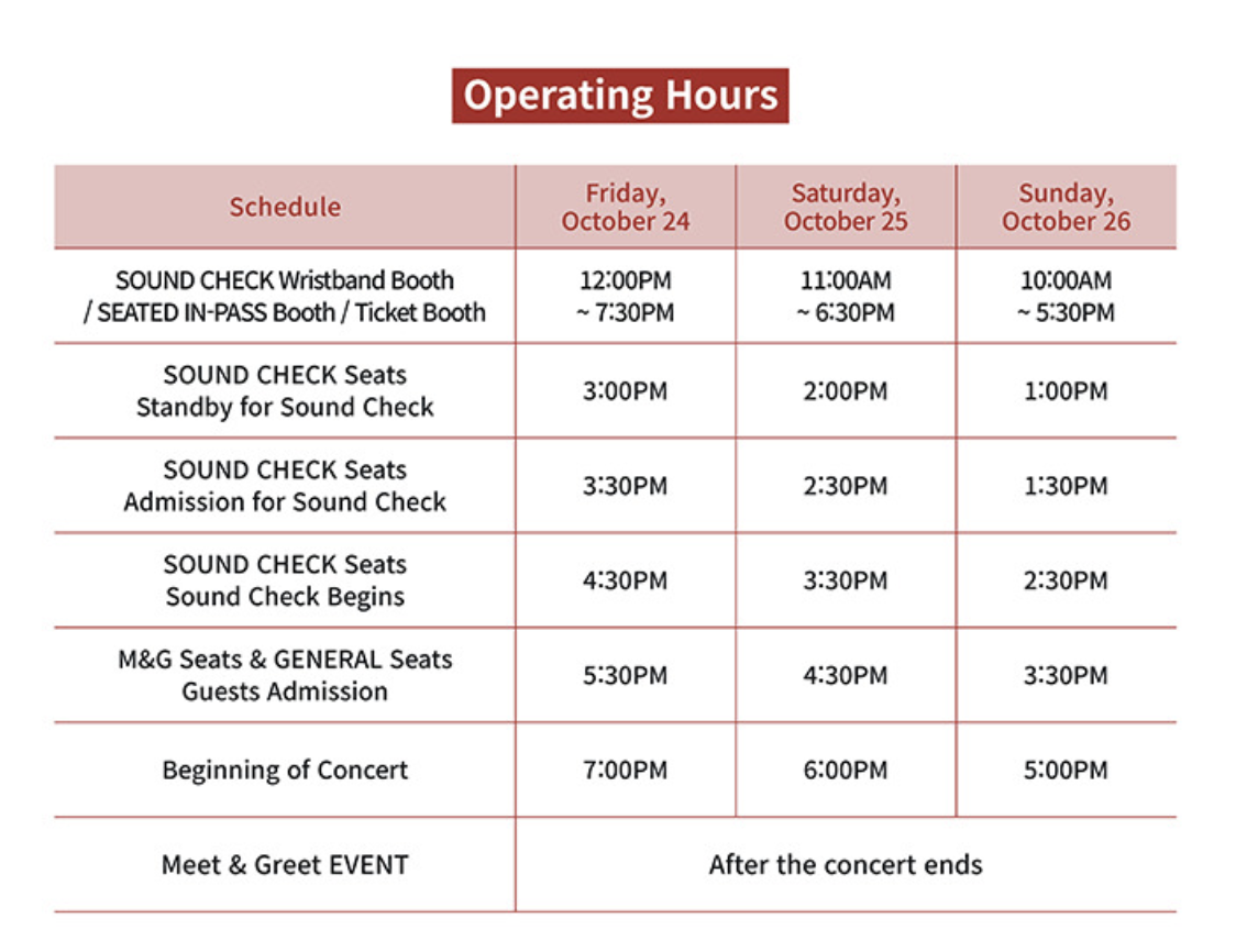 The Sound Check event will take place around 2 hours and 30 minutes before the concert. Once the Sound Check event concludes, re-entry is not permitted if you exit the concert venue. However, you will be allowed to use the lobby, including the restrooms, inside the venue.