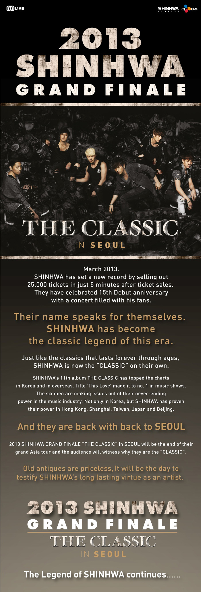 - ‘2013 SHINHWA GRAND FINALE “THE CLASSIC” in SEOUL’ will not have any additional foreign fan ticket sales nor have any outside agent handling tickets. Artist label is monitoring on any purchase through person, internet second-hand websites(ex. JOONG-GO-NA-RA)and other illegal routes. Any purchases through these illegal routes may result in cancellation without notice, and prohibited from entering the concert hall even if you have a ticket. Any person who is selling tickets illegally will be pressed charges, therefore please follow the precautions and we appreciate your cooperation.