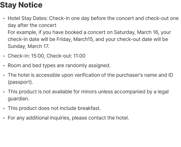 • Concert and accommodation are linked and cannot be canceled separately.