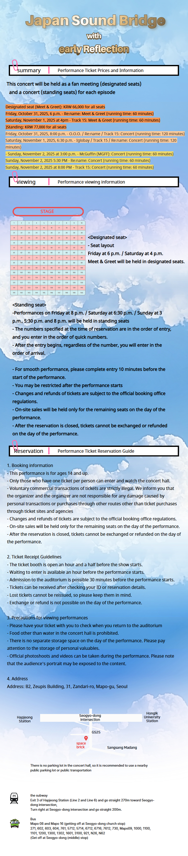 We would like to inform you that the performance of Japan Sound Bridge: with Early Re fl, which was scheduled to be held at SPACE BRICK in Hongdae from October 31st (Friday) to November 2nd (Sunday), 2025, was inevitably canceled due to internal circumstances of the host company AGENTATIVE (Korea).