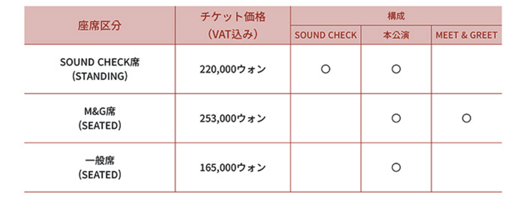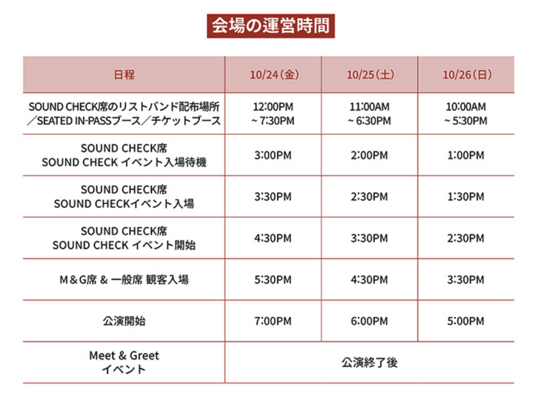 SOUND CHECK サウンドチェックイベントは各公演の約2時間30分前に実施されます。サウンドチェックイベント終了後に会場外へ退出された場合、再入場はできません。会場内のトイレを含むロビーの利用は可能です。 M&G Meet&Greet イベントは本公演後にアーティストと挨拶を交わすイベントで、約10分間行われます。各公演終了および一般観客の退場(約40分前後)の後に実施されます。