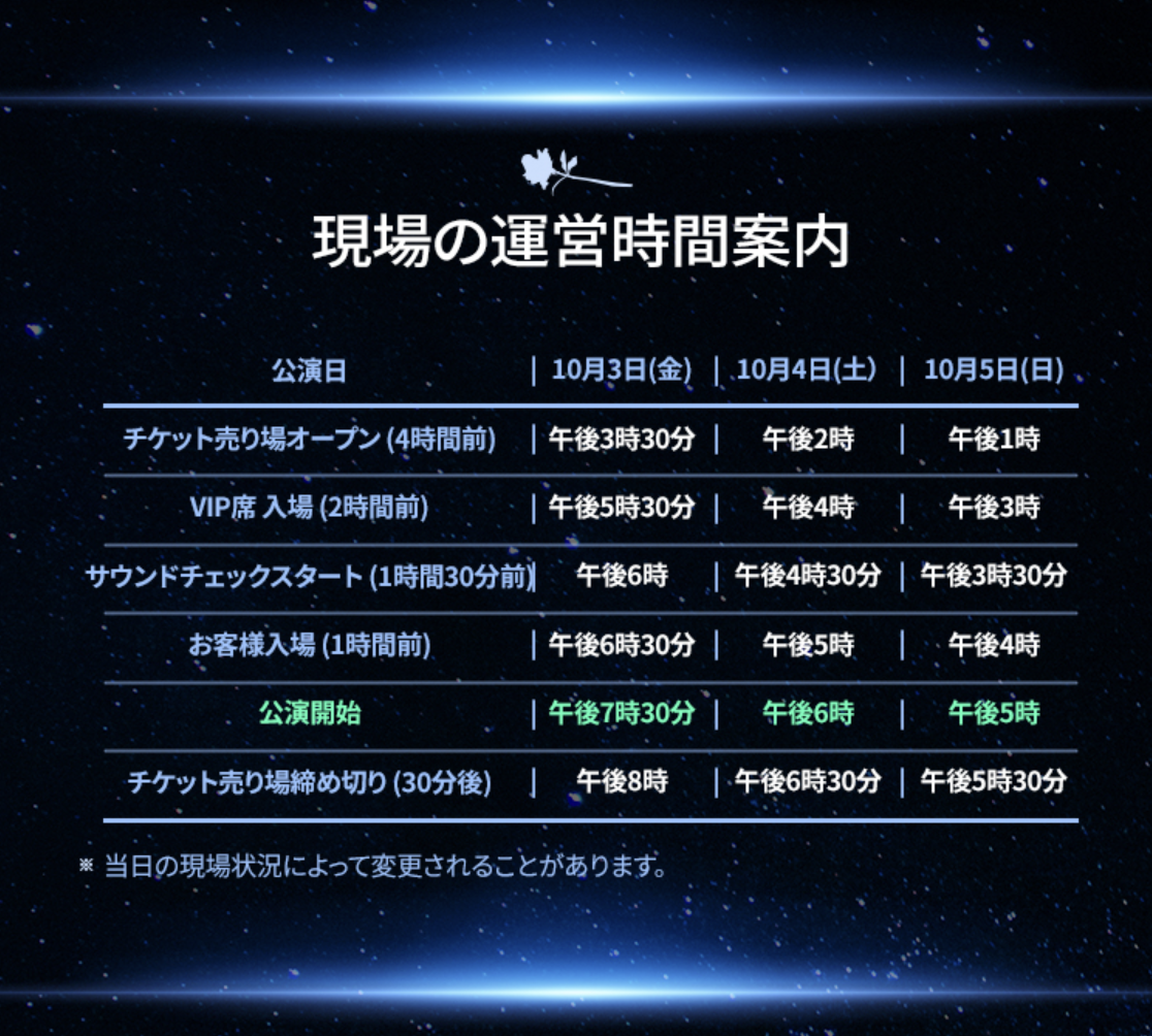 VIP席はサウンドチェック観覧が可能なので、公演開始2時間前から入場できます。一般席の場合、公演開始1時間前から入場できます。現場の状況により入場時間が変更される場合があるのでご注意ください。