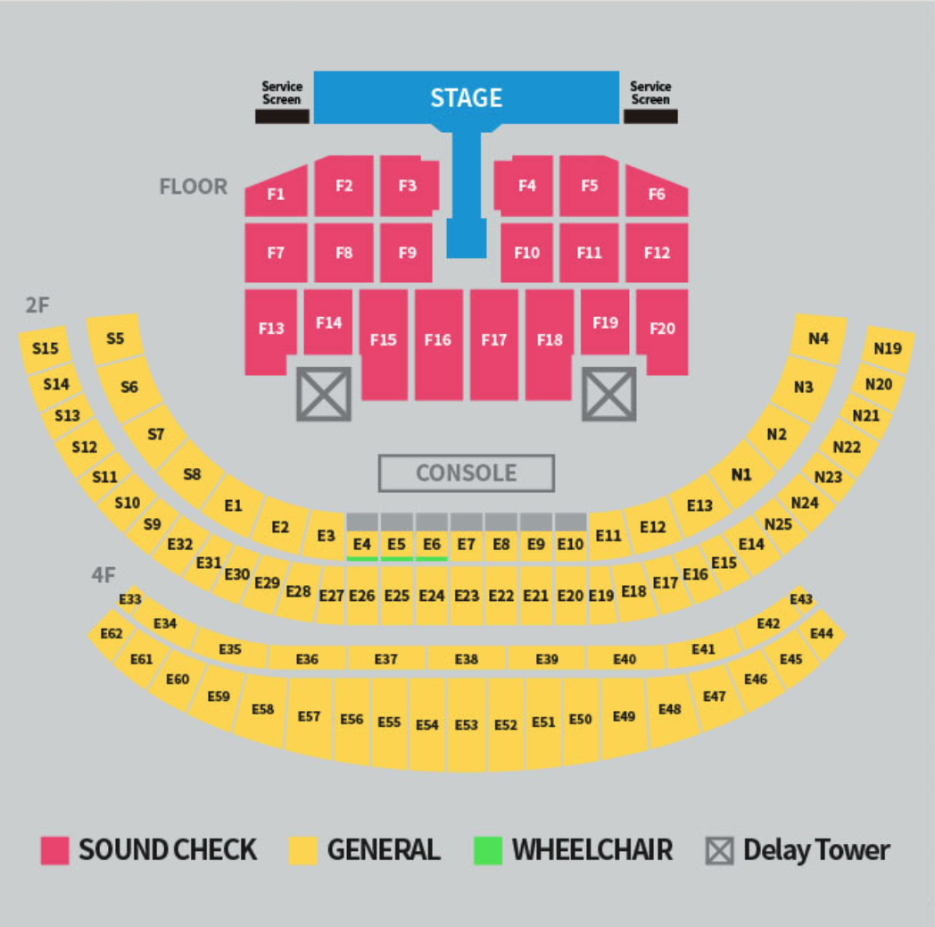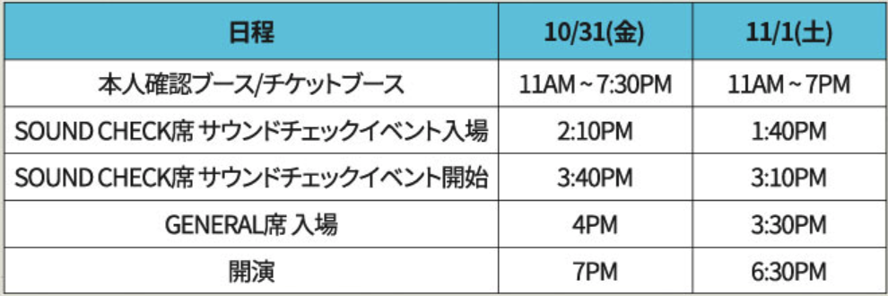 SOUND CHECK席とGENERAL席は、入場時間が異なりますので、下記の表をご確認ください。GENERAL席の場合、公演開始3時間前から入場可能です。運営時間は当日の現場状況により変動する場合があります。