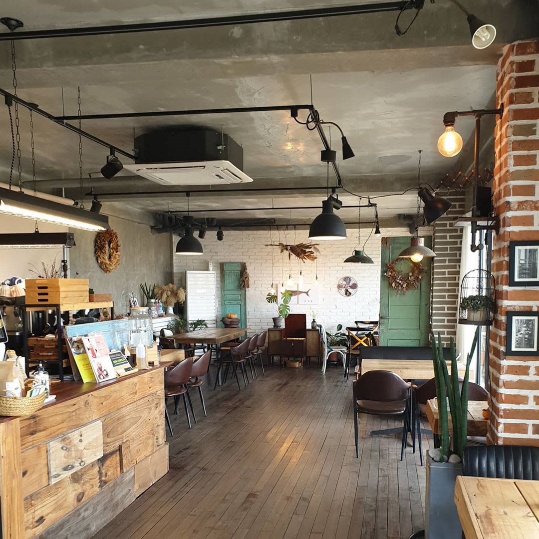 赤い夕日に染まる水平線がロマンチックな雰囲気を演出するカフェ