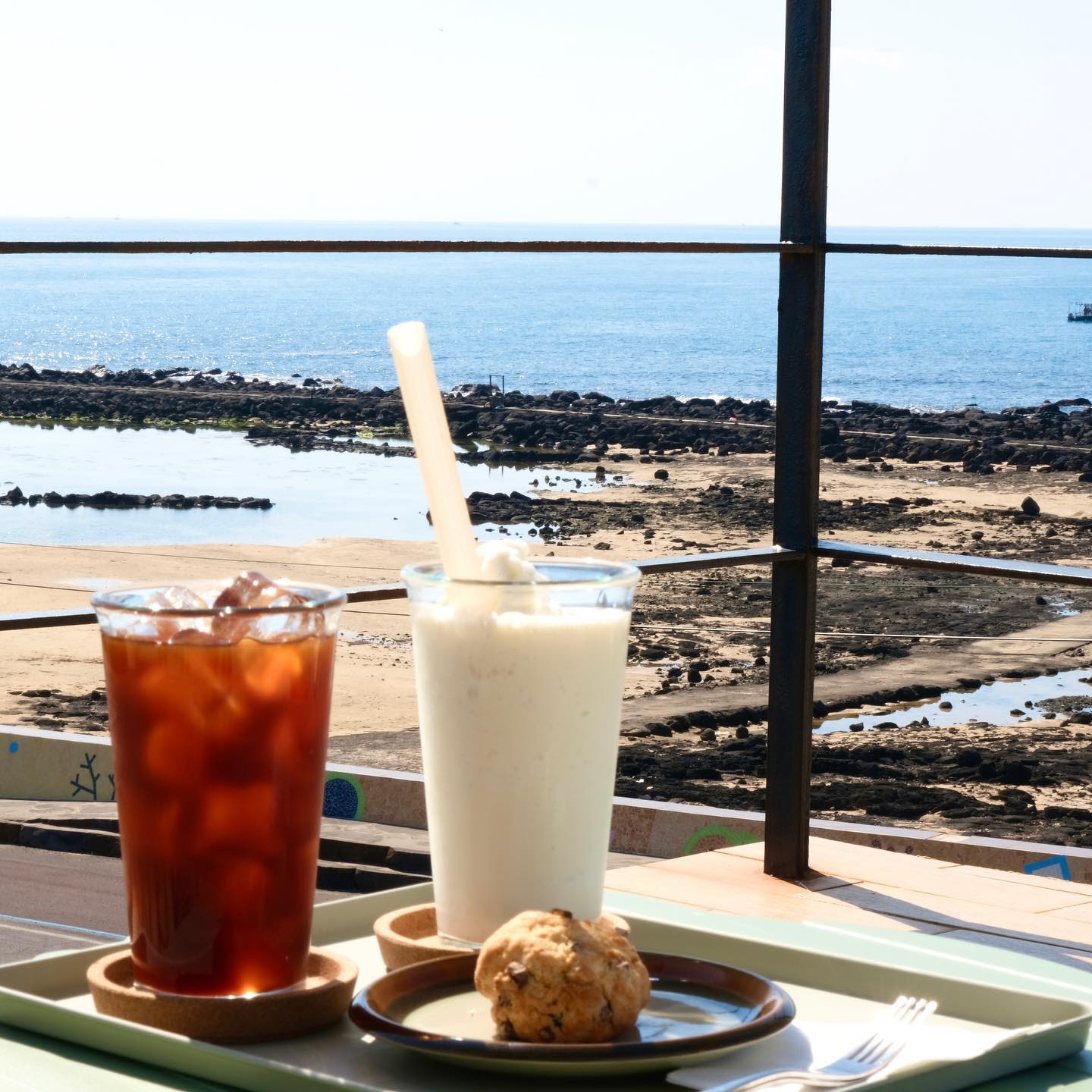 イルカの泳ぐ姿が見られるオーシャンビューデザートカフェ