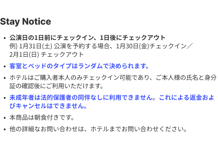 ・宿泊と公演のキャンセルは同時に行われるため、部分キャンセルはできません。