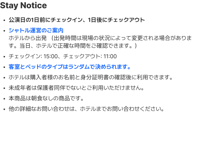 ・宿泊と公演のキャンセルは同時に行われるため、部分キャンセルはできません。