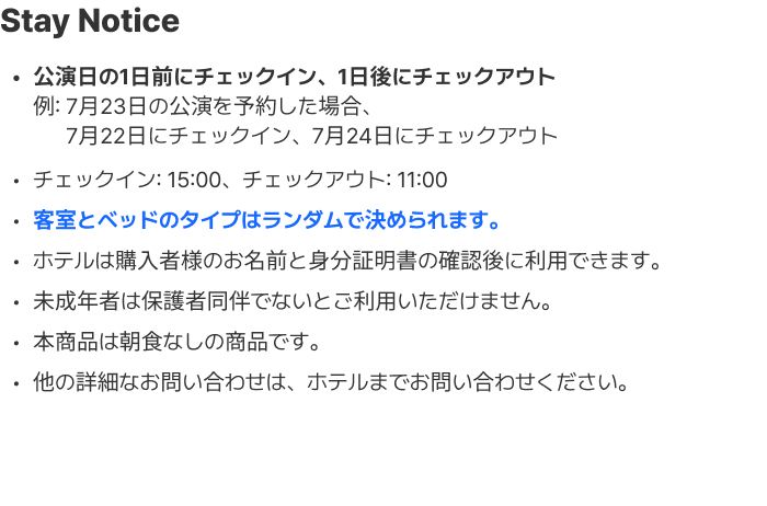 ・宿泊と公演のキャンセルは同時に行われるため、部分キャンセルはできません。