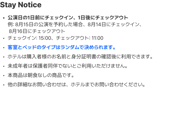 ・宿泊と公演のキャンセルは同時に行われるため、部分キャンセルはできません。