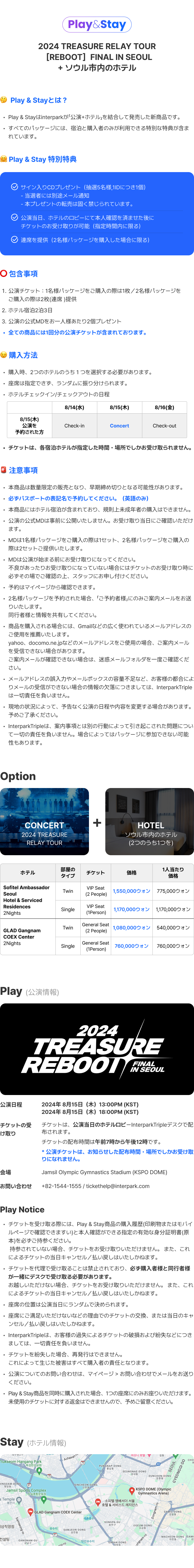 ![[Play&Stay] 2024 TREASURE RELAY TOUR [REBOOT] FINAL IN SEOUL+Hotels in Seoul](https://ticketimage.interpark.com/Play/image/large/24/24009942_p.gif)