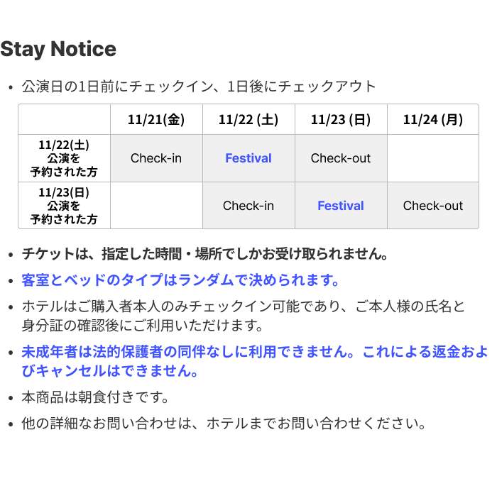 ・宿泊と公演のキャンセルは同時に行われるため、部分キャンセルはできません。