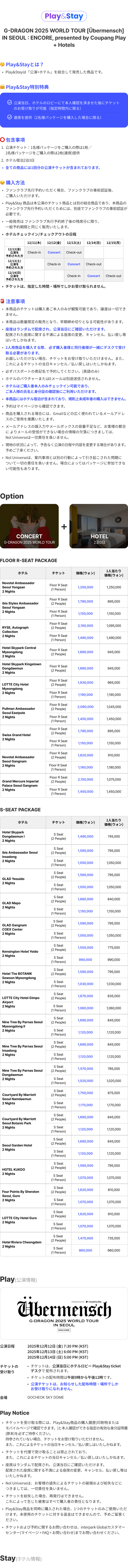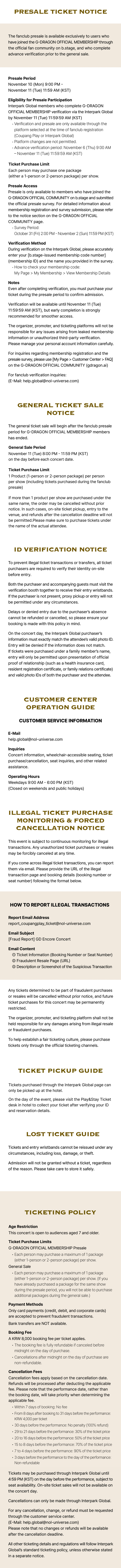 - G-DRAGON OFFICIAL MEMBERSHIP 先行予約:1人につき1公演あたり最大1商品(1名パッケージまたは2名パッケージ)のみ購入可能です。