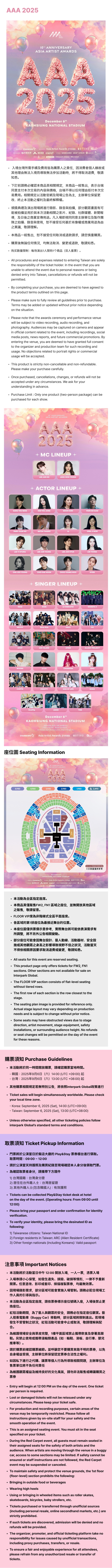 ※ 請確實核對訂購內容及下列規定,本票券一經售出,表示台端同意支付本次交易的內容與價格,台端不得以任何理由拒付本次交易費用。相關規定以活動官網及現場公告為主,主辦單位保留修改、終止及本活動相關演出內容之權利。