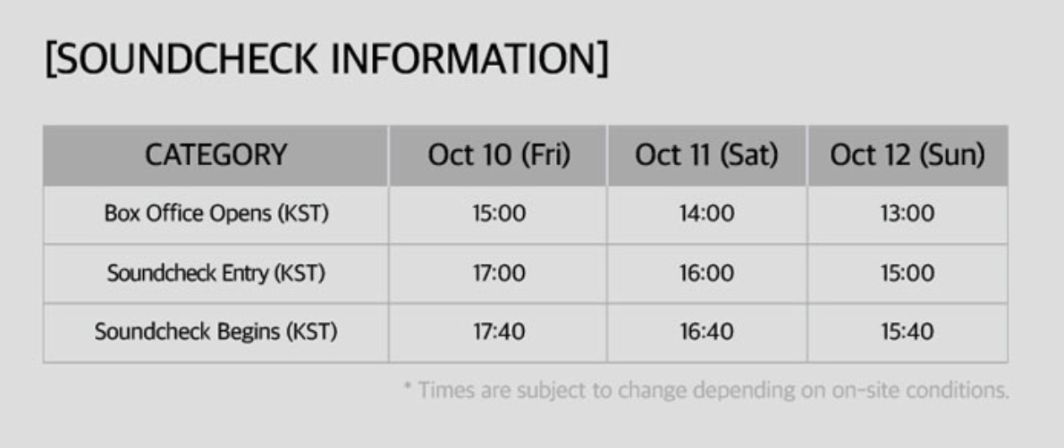 VIP 座位观众可参与 Sound Check,因此可在演出开始前 2 小时入场。普通座位、幸运座位则可在演出开始前 1 小时入场。请注意,入场时间可能会根据现场情况有所调整。
