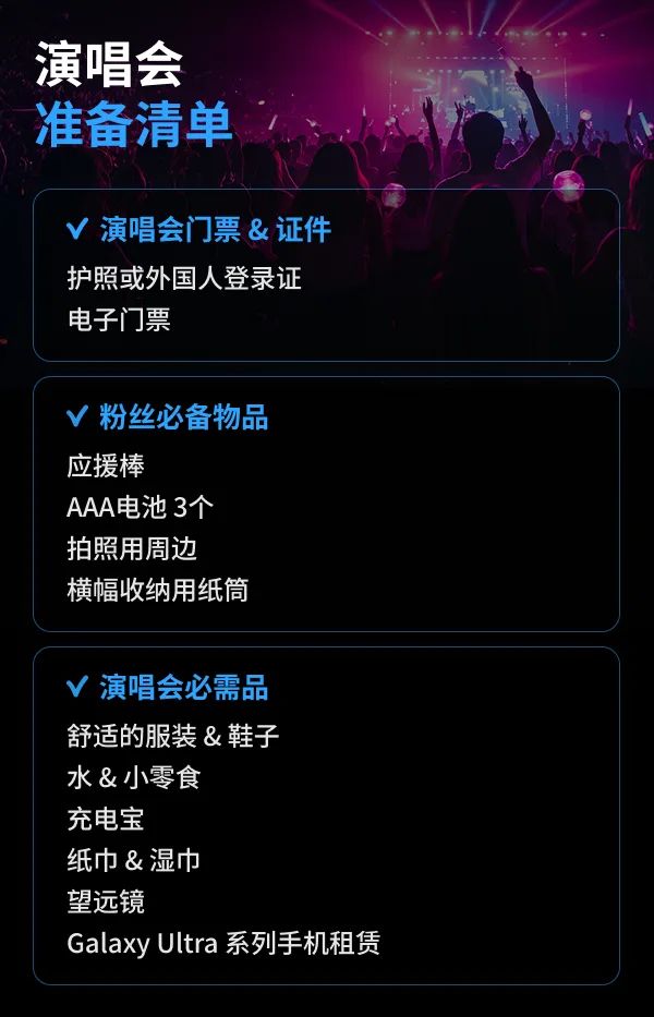 别忘了带上身份证、应援棒和电池。为了拍纪念照,建议带上小卡、玩偶等周边。若座位较远,望远镜也是不错的选择。有了这份清单,就算是准备完成啦!✨