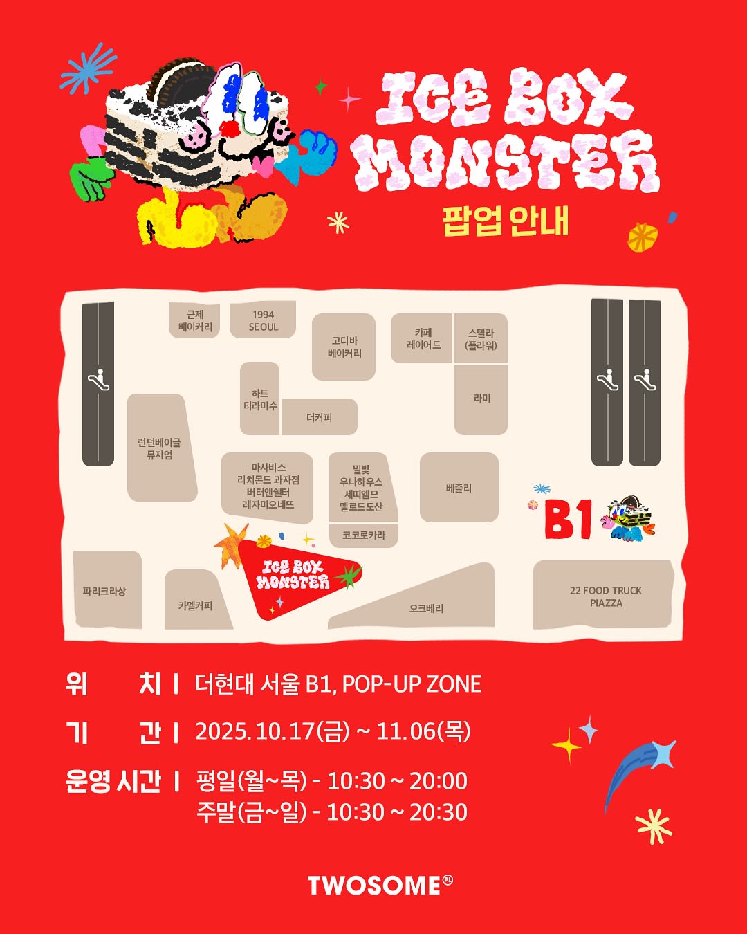 - 备受欢迎的韩国连锁咖啡厅 A Twosome Place 将推出以其最畅销的冰盒甜点😋为主题的快闪店。 与韩国平面设计师 Cha Incheol 合作,创造了一个全新的 "Abakmon "角色,其中包括三种最受欢迎的招牌口味--Abakmon(舀起的冰盒)、Malbakmon(舀起的抹茶冰盒)和 Bebakmon(舀起的莓果冰盒),以及三种仅在快闪店期间供应的特殊口味:Mamelmon(棉花糖冰盒)、Peanutmon(花生酱冰盒)和 Minchomon(薄荷巧克力冰盒)。 还将带来今年曾引起 "售罄狂潮"、最受欢迎的舀式抹茶牛油果的全蛋糕版本! 📍 现代百货The Hyundai Seoul 流行区 🗓️ 25.10.17(五)- 25.11.6(四)
