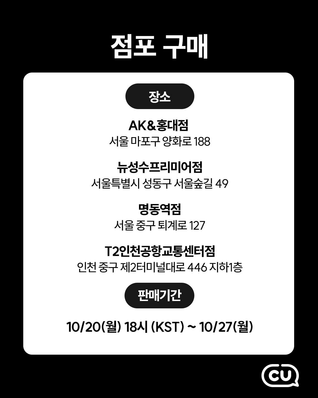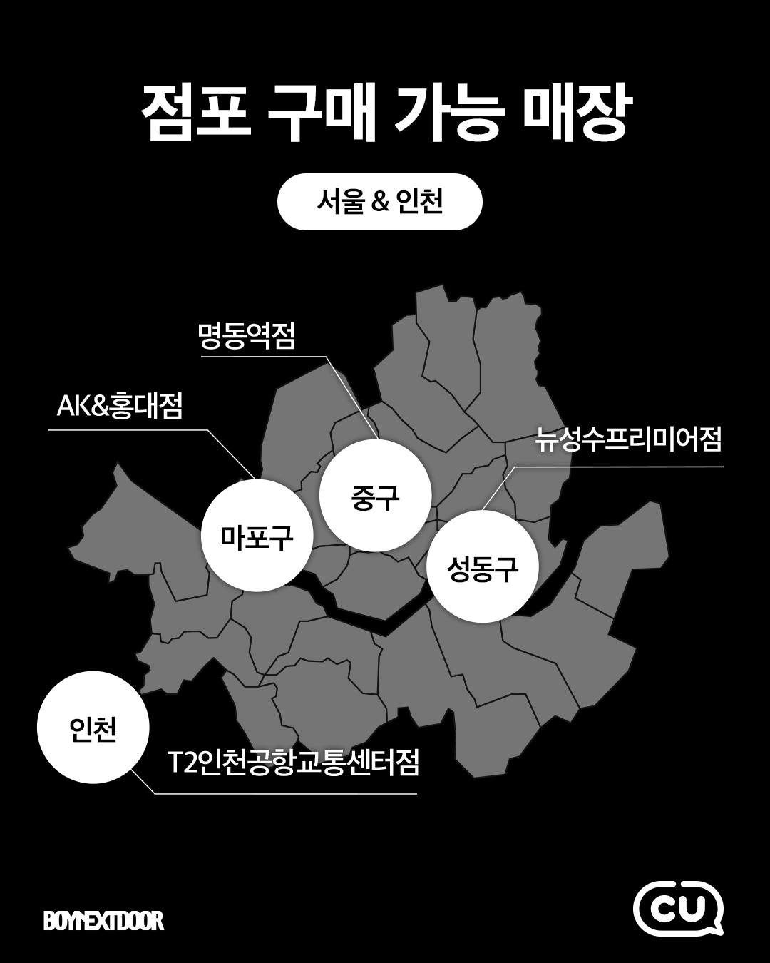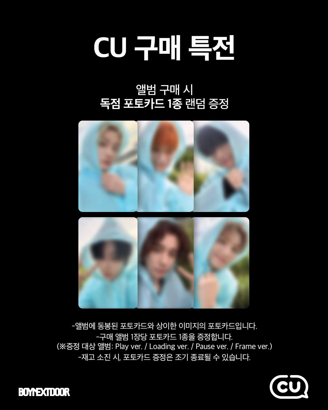 - 您知道 BOYNEXTDOOR 的第 5 张迷你专辑《The Action》现已在 CU 上架了吗? 在 Pocket CU 应用程序和 CU 线下商店购买 BOYNEXTDOOR 的第 5 张迷你专辑 [The Action],即可获得一张专属 CU 相片小卡。共有五张专辑可供选择:《Play》、《Loading》、《Pause》、《Frame》和《Weverse》,每张专辑附带一张相片小卡(Weverse 版本除外)。 📍线下商店 - CU AK & 弘大 188, Yanghwa-ro, Mapo-gu, Seoul - CU 新圣水 Premium 49, Seoul Forest-gil, Seongdong-gu, Seoul - CU 明洞站 127, Deunggye-ro, Jung-gu, Seoul - CU T2 仁川机场交通中心 B1, 446, Terminal 2-daero, Jung-gu, Incheon 🗓️ 线下商店销售 25.10.20(一)- 25.20.27(一) Pocket CU 销售 25.10.2(四)- 25.10.27(一)