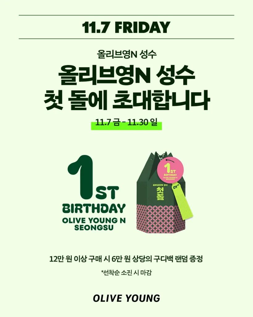 - 位于圣水洞的美容购物圣地 Olive Young N 圣水店庆祝开业一周年👏 Olive Young N 圣水正在庆祝其一周年生日,并准备了各种礼品!请查看各活动的日程安排! ✔️ 购物满 120,000 韩元可免费获得价值 60,000 韩元的礼品袋(11.7 - 11.30) ✔️ Olive Young N 圣水限定一周特价(11.17~11.23) ✔️ 每天免费获得不同成分的 N 圣水礼品袋(11.17~11.23) ✔️ 购物满 50,000 韩元赠送手提袋(11.17~11.23日) ✔️ 先到先得,购物满 150,000 韩元送 30,000 韩元礼品卡 (11.17~11.23) 📍 Olive Young N 圣水 🗓️ 2025.11.7(五) - 2025.11.30(日)