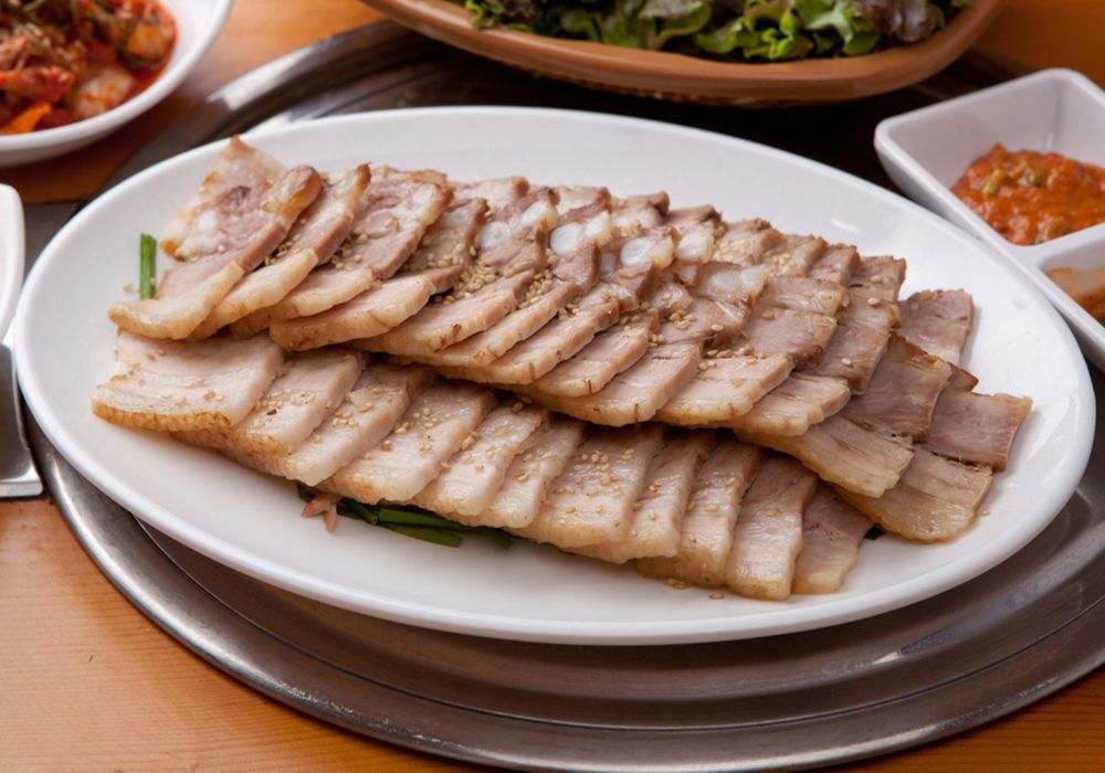 由米饭、白切五花肉、大酱汤、包饭拼盘、调味大酱组成的菜单