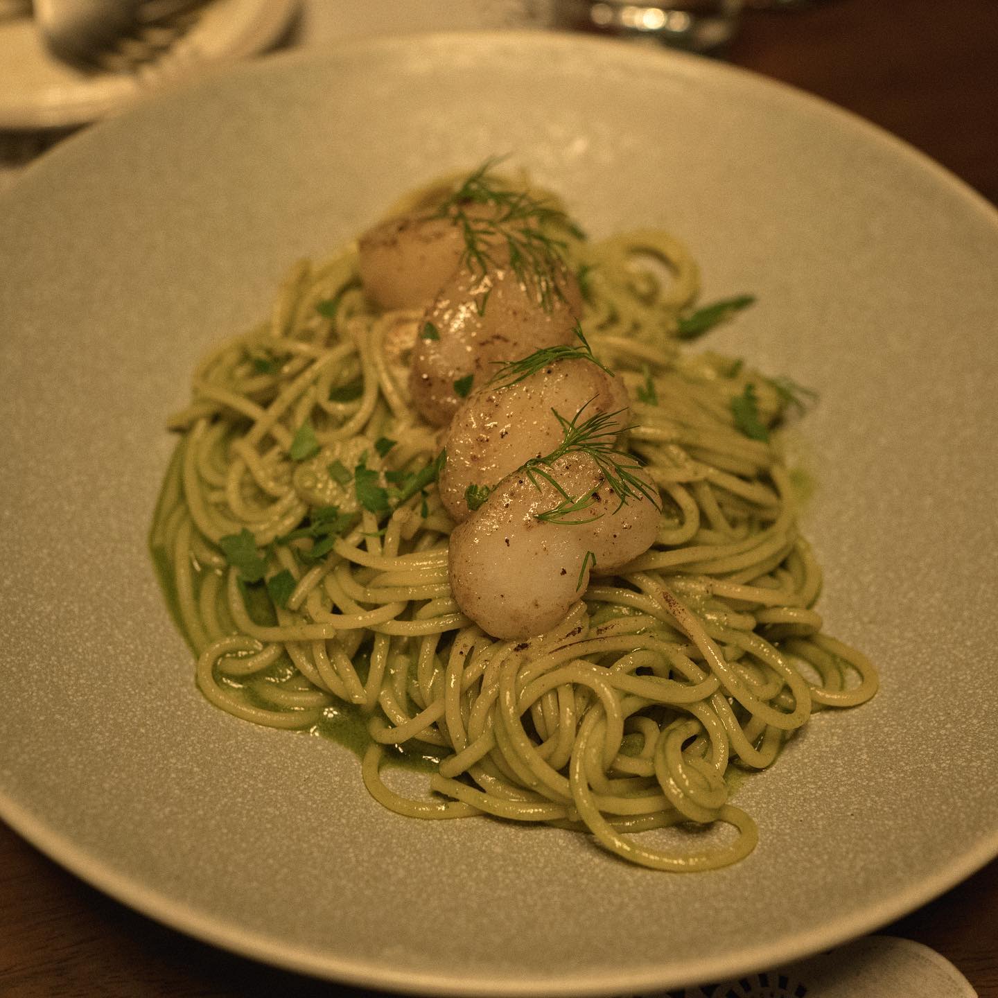 煮熟的意大利面搭配香蒜酱、扇贝等炒制的意面