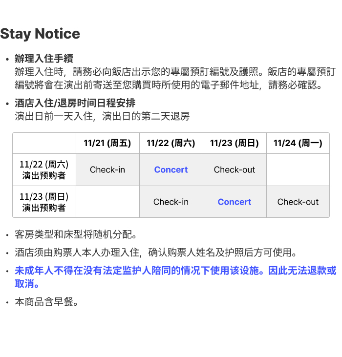 本商品由 ㈜NOL Universe 预先采购并确定的演唱会门票及酒店组成,因此适用 特别条款。