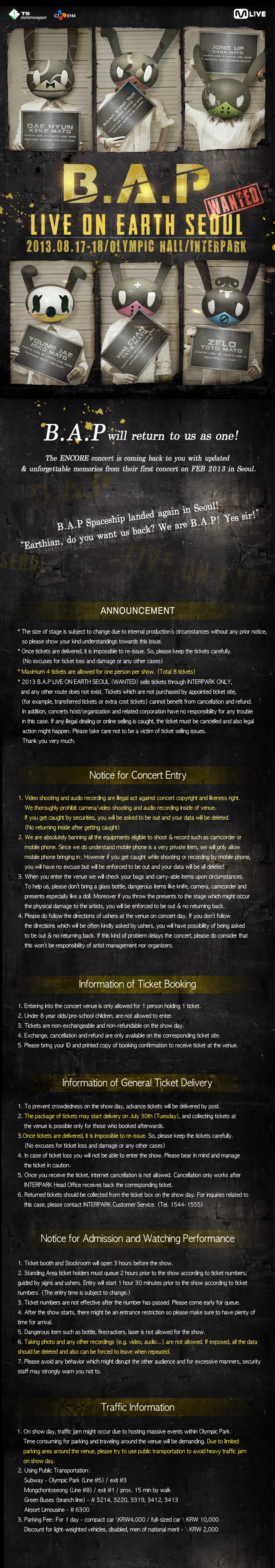 TS Entertainment and CJ E&M are having an exclusive agreement with H.I.S towards ticketing in Japan, so if anywhere else is treating tickets for ‘B.A.P LIVE ON EARTH SEOUL WANTED’, it should be illegal.
