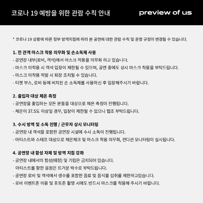 Before reserving a ticket, please check the rules and regulations implemented by the Korean government to limit the spread of COVID-19.