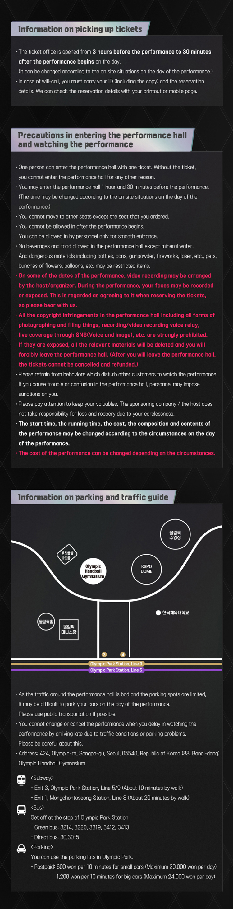 • 预约确认:确认My Page or E-mail • 本商品是2人专用商品。 • 本商品是针对外国游客的特价商品。 • 另行咨询演出相关事宜时,可通过My Page>Leavean Inquiry进行电子邮件咨询。