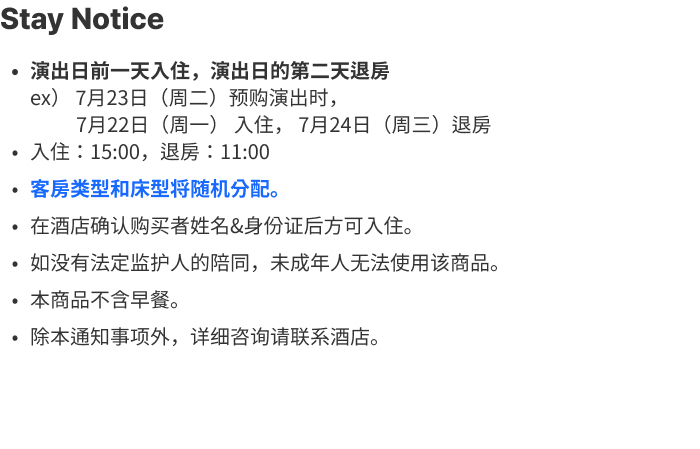 取消相关规定 • 可直接通过我的页面>预定/取消明细内进行取消。 • 住宿和演出取消将同时进行,不可部分取消。 • 取消手续费 参观日23日前不收取取消手续费 参观日15~22日前取消时手续费30% 参观日8~14日前取消时手续费50% 参观日3~7天前取消时手续费70% 从参观日2日前开始,参观日 当天取消时手续费100%不可退还