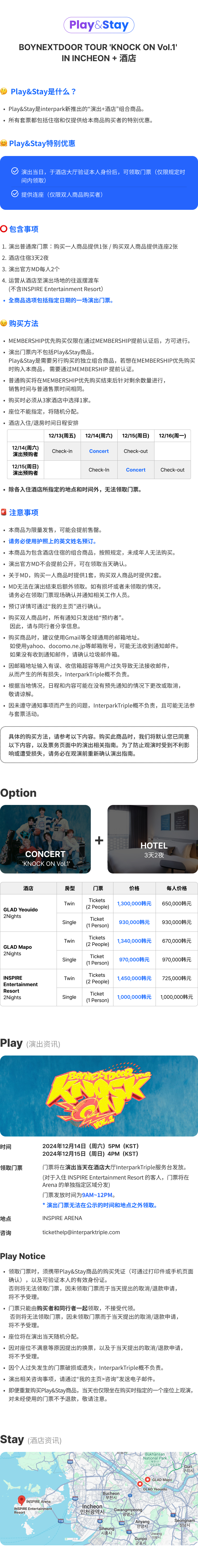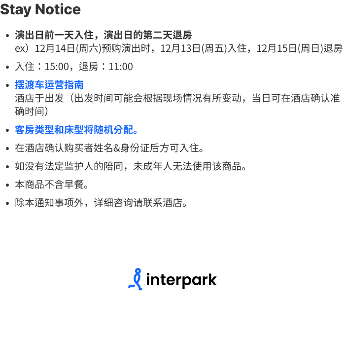 • 可直接通过我的页面>预定/取消明细内进行取消。 • 住宿和演出取消将同时进行,不可部分取消。 • 取消手续费 参观日31日前不收取取消手续费 参观日21~30日前取消时手续费30% 参观日16~20日前取消时手续费40% 参观日8~15日前取消时手续费60% 参观日4~7天前取消时手续费80% 从参观日3日前开始,参观日 当天取消时手续费100%不可退还
