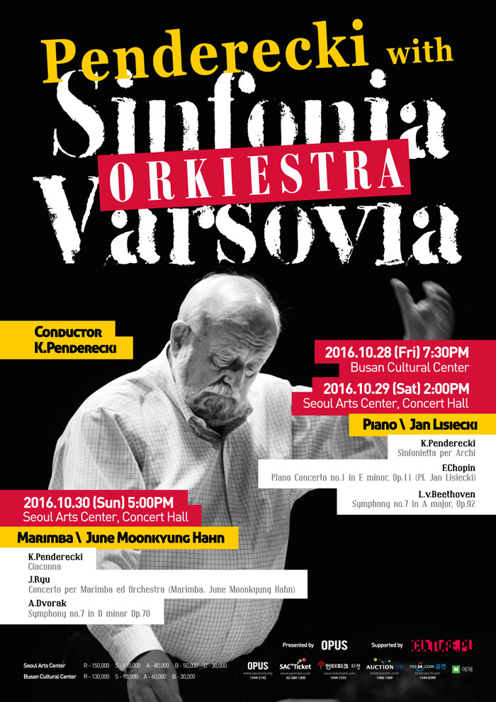On the occasion of the first tour in Korea, the orchestra will present various pieces such as Penderecki’s “Sinfonietta per Archi”, “Ciaconna”, Chopin’s “Piano Concerto no.1”, Beethoven’s Symphony no.7 and Dvorak’s Symphony no.7. Especially on 30th October, “Marimba Concerto” by Jeajoon Ryu, apprentice of Penderecki, will be played by Marimbist June Moonkyung Hahn, adding more significance to this concert tour.